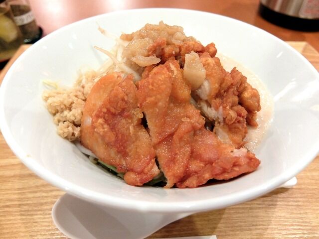 具は唐揚げ、ヤサイ(モヤシ・キャベツ)と無料トッピング。サックサクの唐揚げがめっちゃ激ウマ!