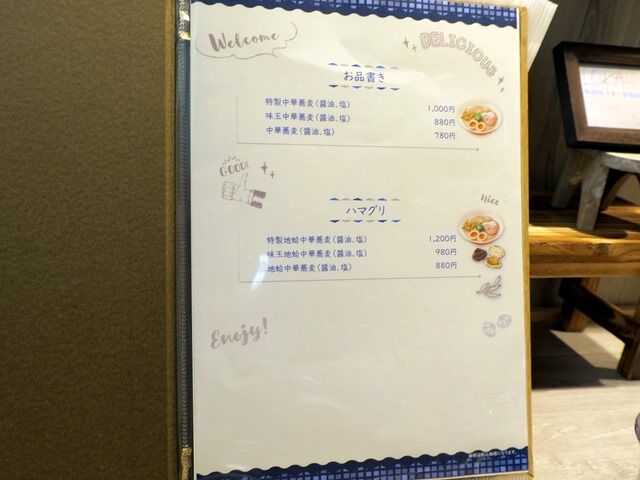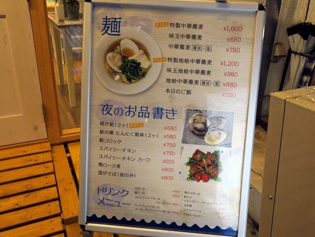 券売機は無く後会計制。主なメニューは中華蕎麦醤油・塩780円、地蛤中華蕎麦880円、他。