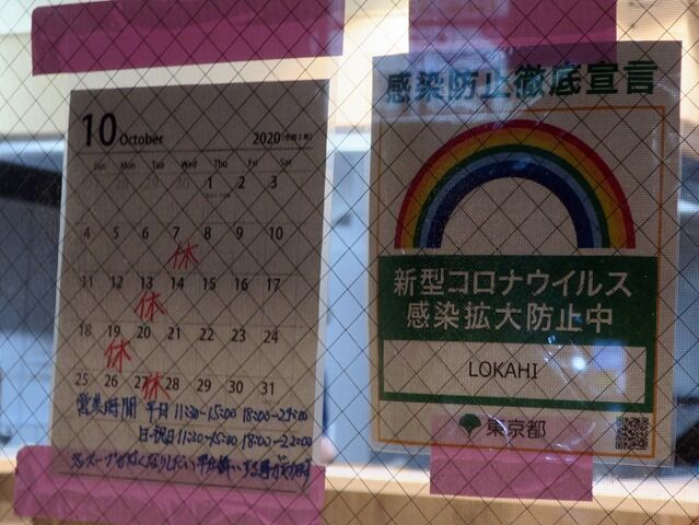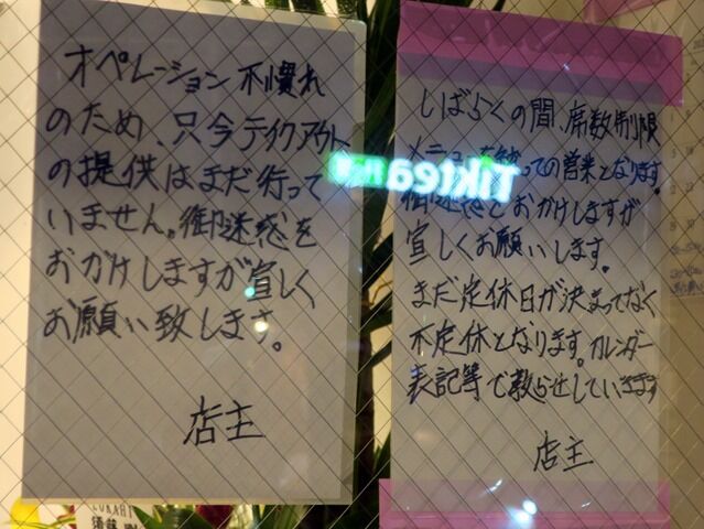 当面テイクアウト休止、座席・メニューを絞っての営業、不定休。