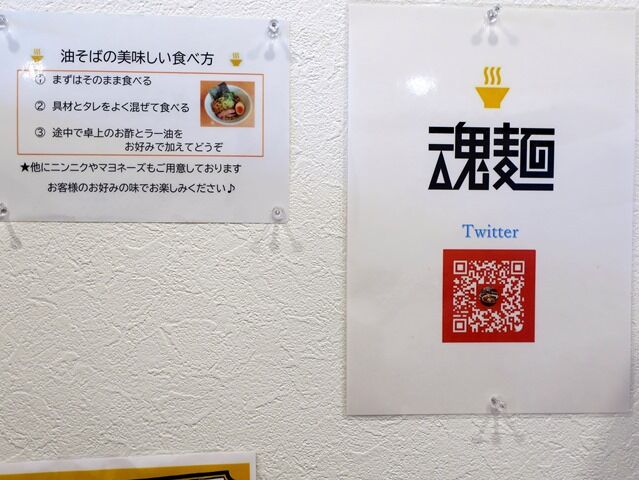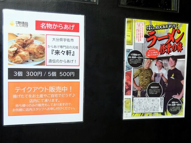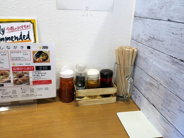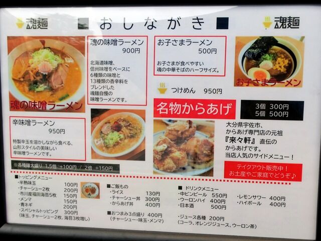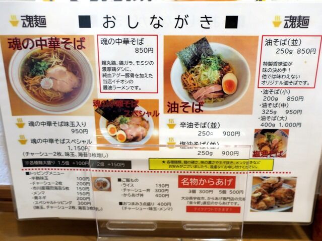 券売機はなく後会計制。主なメニューは、魂の中華そば850円、魂の味噌ラーメン900円、辛味噌ラーメン950円、油そば並250g850円、名物からあげ3個300円、他。