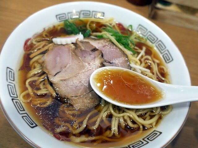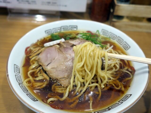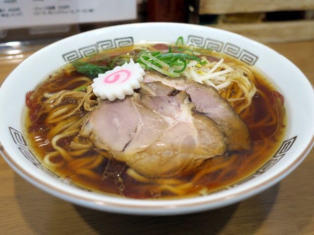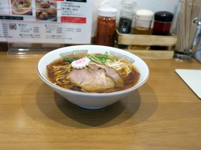 具はチャーシュー2枚、メンマ、なると、青ねぎ。なるとはメニュー画像では丼から湯気の出た銭湯マークみたいな柄ですが、今回は普通ののの字型でした。