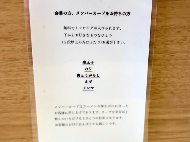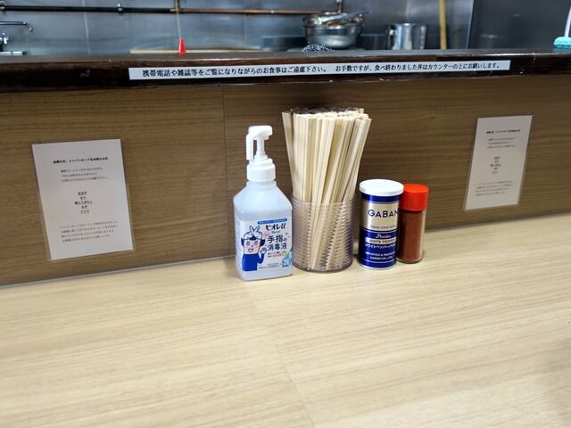 BGMはj-POP。箸は割り箸。卓上調味料はGABANホワイトペッパー、一味唐辛子。消毒液は券売機横と卓上に設置。メンバーズカード提示でトッピングサービス。カードは神保町と共通で相互利用可だそうです。私も黒帯カード持ってますが、行使せず。