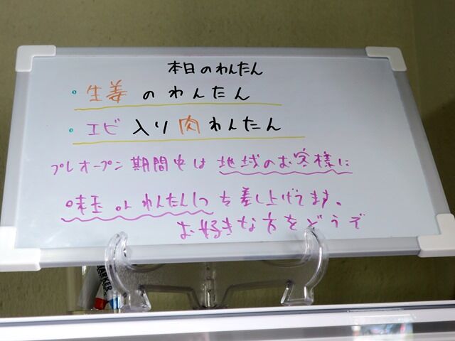 プレオープン中は味玉かワンタンサービス。ワンタンは生姜のワンタンかエビ入り肉ワンタンから選択。