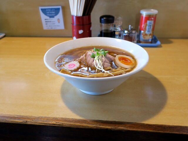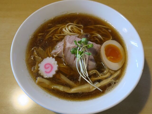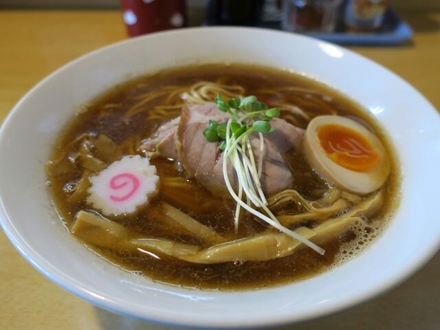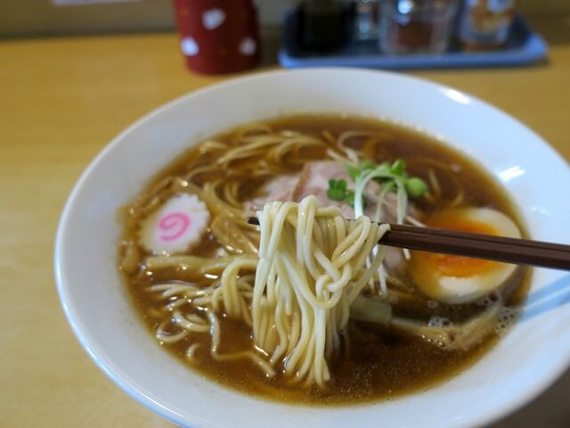 スープはさらさらの清湯醤油味。香ばしい風味の香味油はカメリアラードを使用。店主さんの人柄が反映された様な、柔らかな優しい煮干の効かせ方で、街やお店の雰囲気にぴったり。煮干を始めとした動物魚介の層の厚いうま味がじんわりと広がる癒し系のお出汁で、すごく美味しい!