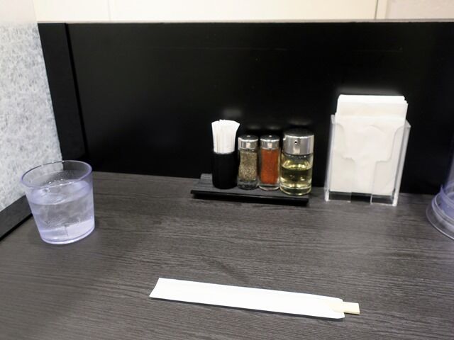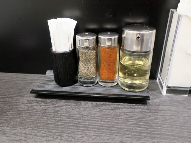 BGMはヒップホップ。箸は紙袋入り割り箸。卓上調味料は黒胡椒、一味唐辛子、酢、