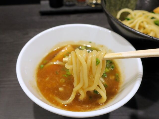 つけ汁はとろどろでソースみたいな高粘性タイプ。おなじみの豚骨魚介ですが、麺をディップしてすすると破壊力抜群の重厚な旨味が爆ぜるように広がる感覚は圧巻。さすがのクオリティと貫禄ですごく美味しい!