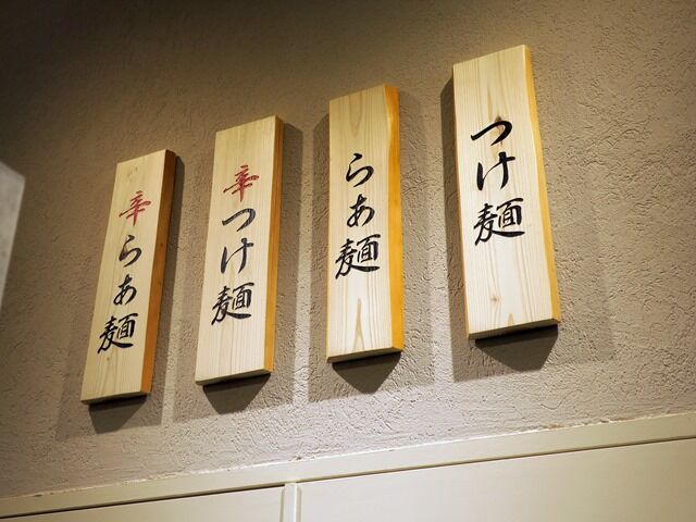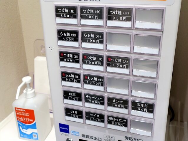 入店するとまず券売機で食券購入です。主なメニューはつけ麺(並)850円、らぁ麺(並)850円、辛つけ麺(並)950円、辛らぁ麺(並)950円、他。