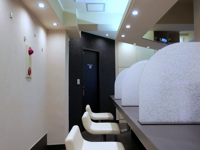 店内は奥が厨房で、厨房を遠巻きに囲む袖の広がった変形凹字型カウンター8席(1・6・1)。