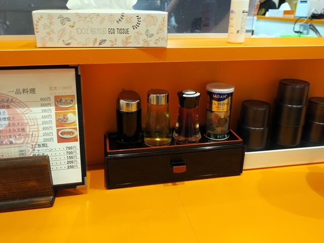 BGMはJ-POP。箸は赤い洗い箸でエコ仕様。卓上調味料は醤油、酢、ラー油、GABANブラックペッパー。