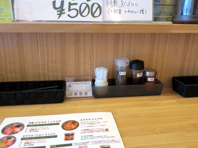 5分前早開けで助かります!券売機はなく先会計制。主なメニューは、まぜそば850円、特製まぜそば1100円、他。まぜそばはポルチーニオイル、辣醤、柚子胡椒から選択。