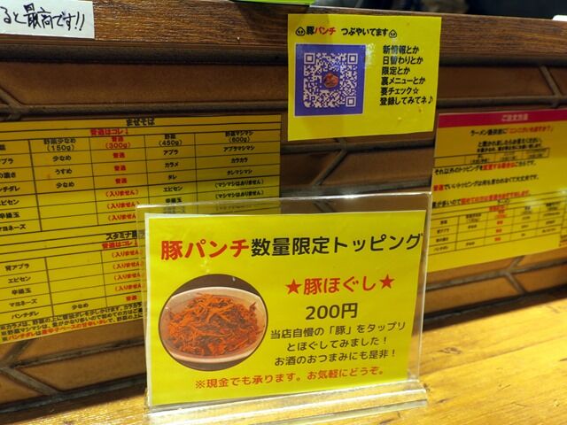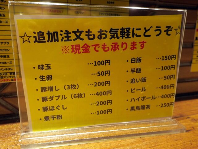 無料トッピングは、麺類共通でニンニク。ラーメンが野菜・背アブラ・味の濃さ・パンチダレ。まぜそばが野菜・背アブラ・味の濃さ・パンチダレ・エビセン・辛揚玉・マヨネーズ。ライス系が背アブラ・エビセン・辛揚玉・マヨネーズ・パンチダレ。