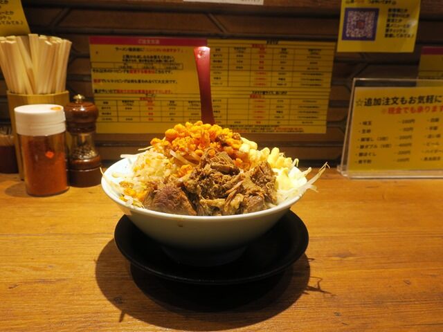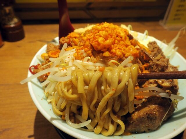 麺は極太でウェーブのあるタイプ。モチモチというよりゴワゴワで、これはこれでガッツリ系にはうってつけの高剛性。公式ではまぜそばは汁なしではありませんと述べられてますが、確かにタレが多めで汁の量はラーメンと遜色ないかも。そのタレですが、相当しょっぱくて、しょっぱインパクト激烈。ただ麺とたっぷりの野菜やトッピングを上手くバランス取っていただくと、さほしょっぱさが気にならず、脂と塩味がかえっていい刺激になります。バラエティに富んだトッピングで極太麺、パワフルなタレでなかかな旨いです。