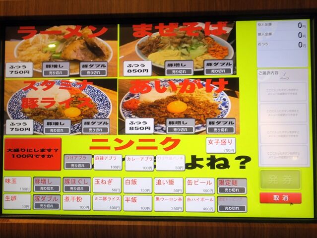 入店するとまずタッチパネル式券売機で食券購入です。主なメニューはラーメン750円、まぜそば850円、スタミナ豚ライス750円、あいがけ850円、他。