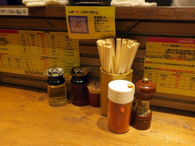 BGMはFM J-WAVE。箸は割り箸。卓上調味料は酢、ラー油、一味唐辛子、ペッパーミル入り胡椒。