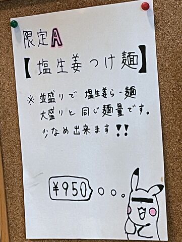 限定は塩生姜つけ麺950円。つけ麺並盛ででラー麺大盛り相当、麺少なめ可能。
