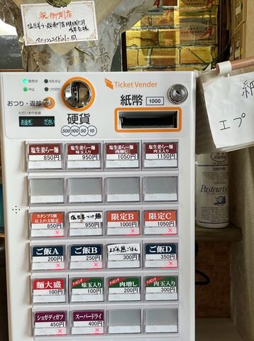 入店するとまず券売機で食券購入です。主なメニューは塩生姜らー麺850円、よだれ鶏ごはん300円、他。