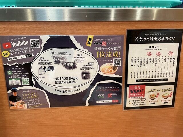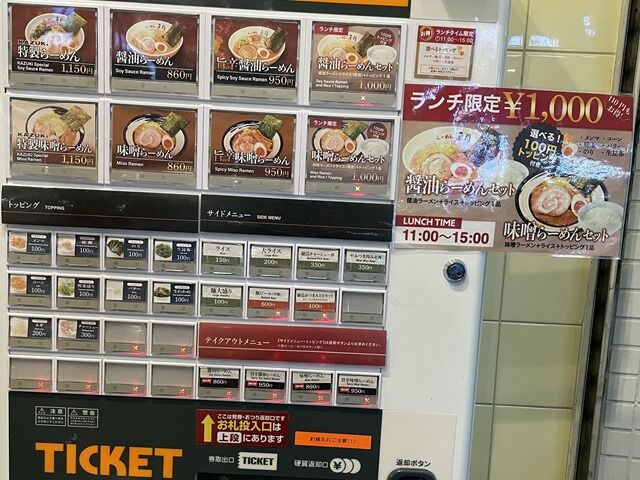 入店前にまず店頭券売機で食券購入です。主なメニューは、醤油らーめん860円、旨辛醤油らーめん950円、味噌らーめん850円、旨辛味噌らーめん950円、他。
