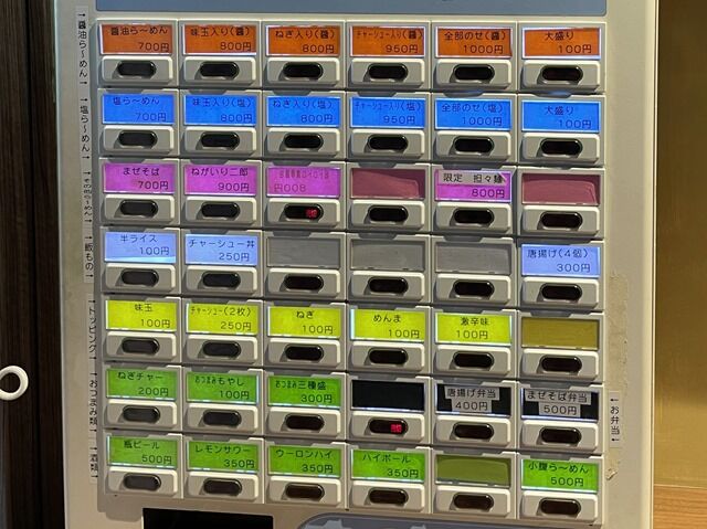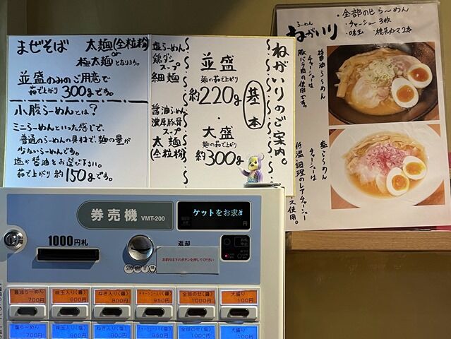 入店するとまず券売機で食券購入です。主なメニューは豚骨醤油らーめん700円、鶏ダシ塩らーめん700円、まぜそば700円、ねがいり二郎900円、限定担々麺800円、他。醤油が豚骨、塩が鶏というコレクター泣かせなラインナップ^^;