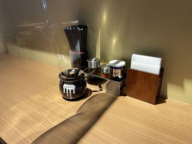 消毒液は券売機隣に配置。カウンターは1席ごとにビニールシートの仕切りを設置。BGMはジャズポーカル。箸は洗い箸でエコ仕様。卓上調味料はGABANホワイトペッパー、自家製辣油、酢、一味唐辛子。