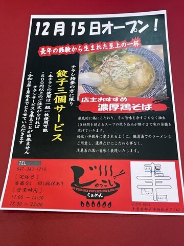 店の場所は南流山駅約1.2km。けやき通り沿い。中華ラーメン五番の跡地。レジ横にあるチラシを見せると餃子3個サービスは次回から。