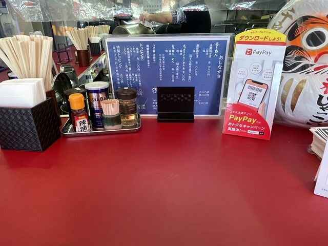 BGMはテレビ放送。テレ朝『DOCTORS~最強の名医~』特番の予告番組なうオンエア。箸は割り箸。卓上調味料はGABANブラックペッパー、手作り餃子用のS&B辣油、醤油、酢。