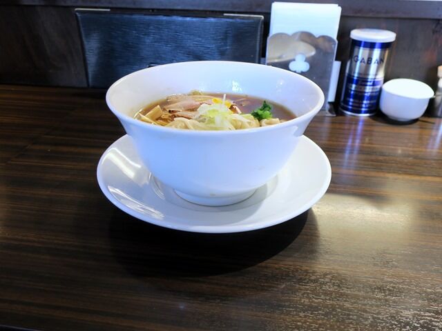 「醤油(中華そば・ワンタンメン)」と同じ受け皿付きの白い反丼で着丼。