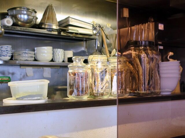 スタッフは厨房に店主さんとサポートの男子の2名体制。BGMはロカビリー。箸は洗箸でエコ仕様。卓上調味料はGABANブラックペッパー。