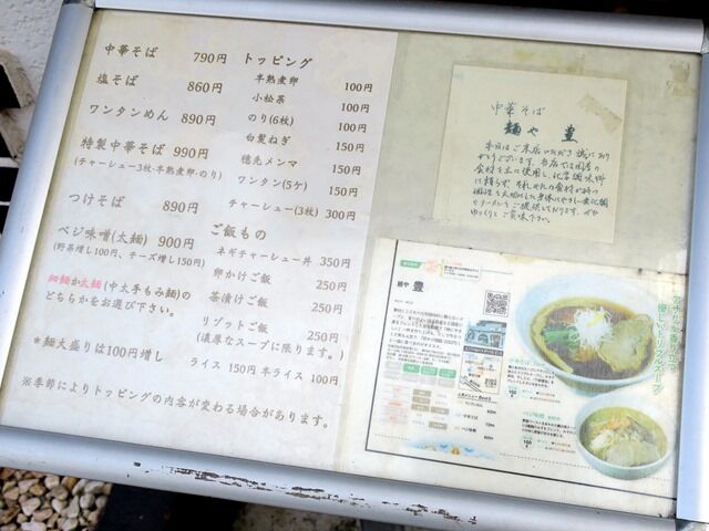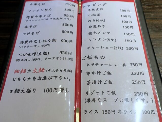 主なメニューは、中華そば790円、ワンタンめん890円、塩そば860円、つけそば890円、特製汁なし担々麺900円、ベジ味噌920円、他。