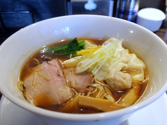 具はチャーシュー、穂先メンマ、青菜、ワンタン、笹切りねぎ、ゆず皮。ワンタンは餡がぎっしり。生姜がガッツリ効いてメチャ旨い!