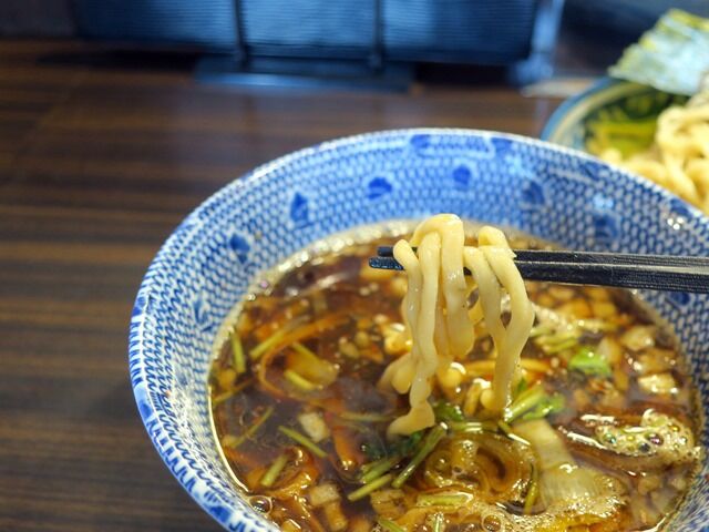 つけ汁はさらさらの清湯醤油味。酸味の効いたちょっと辛目のスパイシーな味わい。今回は麺を細麺・太麺双方試したくてつけそばは太麺にしましたが、さらさらつけ汁には細麺も良く合いそうです。