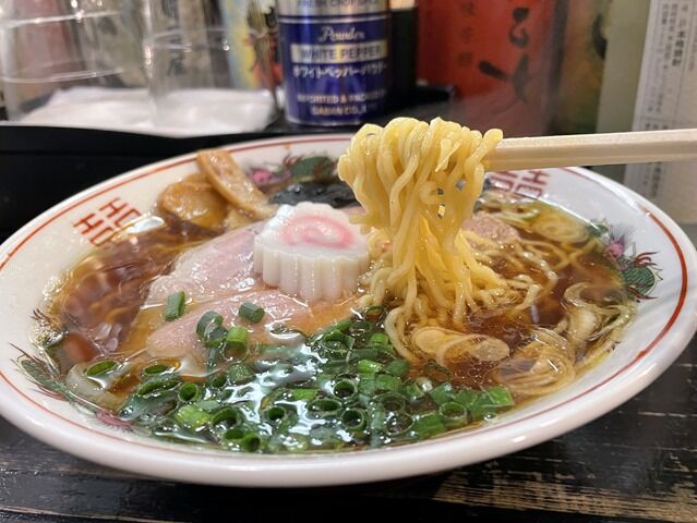 麺は中太縮れタイプ。ツルッとプリッと食感の楽しい麺で一啜りごとにうま味が広がります。