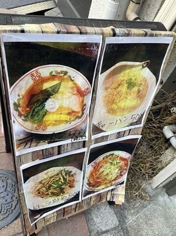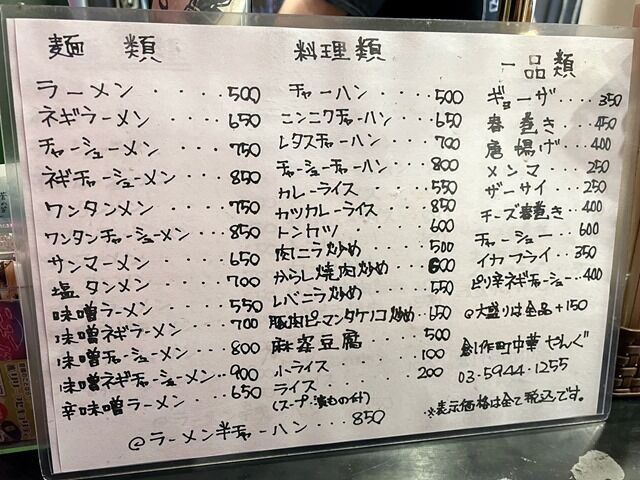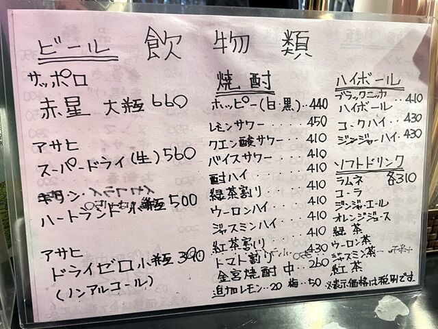 券売機はなく後会計制。主なメニューはラーメン550円、サンマーメン650円、塩タンメン700円、味噌ラーメン550円、チャーハン500円、レバニラ炒め550円、ギョーザ350円、唐揚げ400円、他。