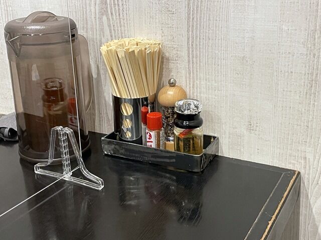 BGMは喧騒でよく分からず^^; 箸は割り箸。卓上調味料は一味唐辛子、ミル入りミックスペッパー、酢。餃子を注文するとラー油と醤油が別途提供されます。