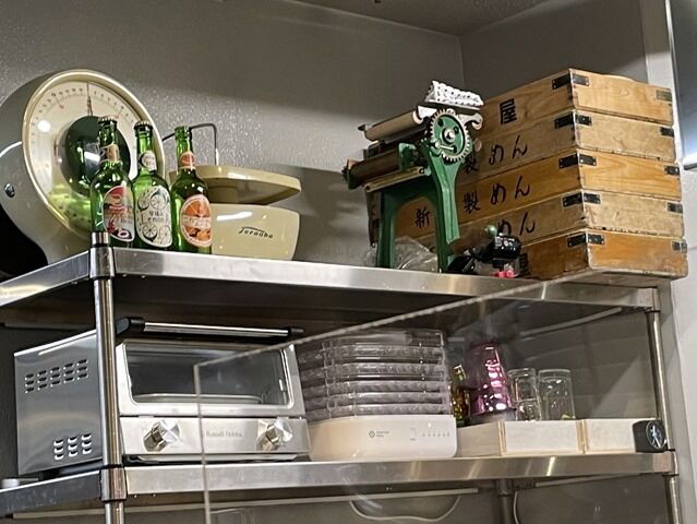 営業用の製麺は製麺室製麺機を使って、厨房の棚にある製麺機はたまに遊びで麺打ちするのに使うそうです。
