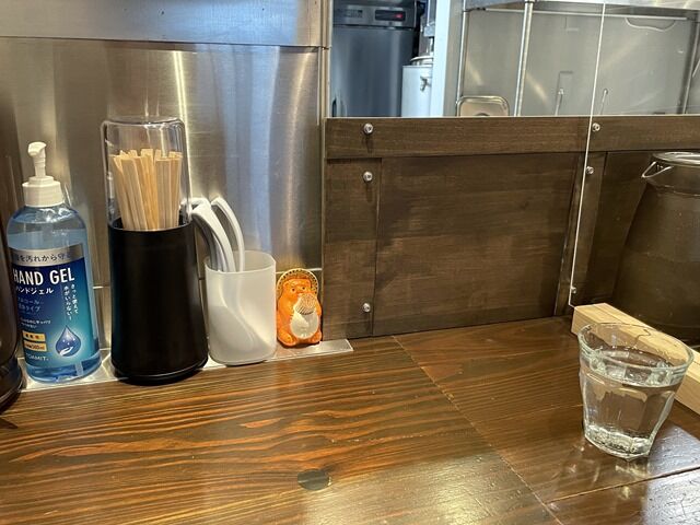 店内は厨房前に真っ直ぐなカウンター5席、3人円卓x1。カウンターは1席ごとにアクリル版の仕切り設置。消毒液は券売機横と各席に配置。