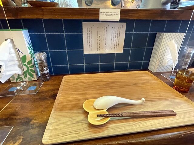 スタッフは厨房に店主さん、ワンオペ体制。BGMはポップス、箸は洗い箸でエコ仕様。卓上調味料はなし。