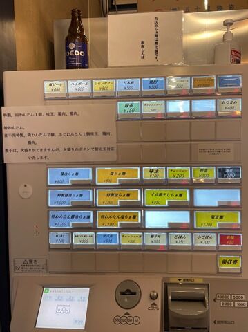 入店すると、まず店内奥突き当たりにある券売機で食券購入です。主なメニューは、醤油らぁ麺800円、塩らぁ麺800円、イカ煮干しらぁ麺850円、他。