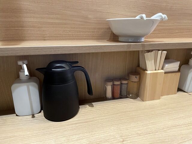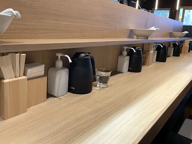 店内は厨房を囲むL字型カウンター9席(6・3)。しろ八時代の面影はなくフルリフォームされて割烹の様。消毒液は券売機横と卓上に配置。