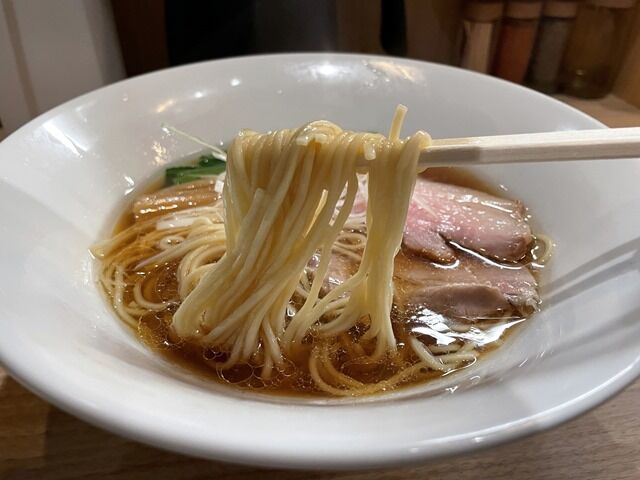 スープはさらさらの清湯醤油味。豚、鶏、煮干し、節系などの食材で摂った無化調無添加スープ。タレは5種類の醤油をブレンド。動物・魚介のバランスが秀逸で、出汁の輪郭がくっきりと鮮やかに鮮明に立体的に迫って来ます。惚れ惚れするような深みと旨味があって、もう一口あと一口とレンゲが止まりません。初日の一杯目でこのクオリティ、ほんとレベル高し。すごく美味しい!