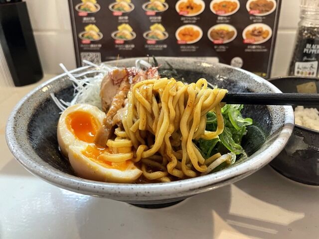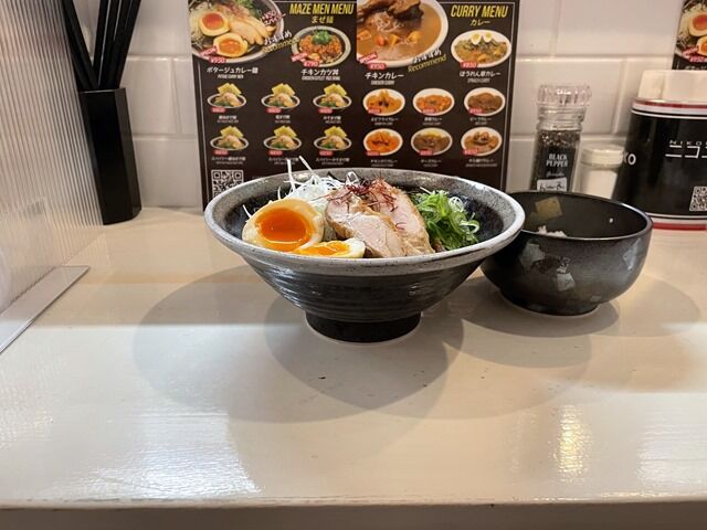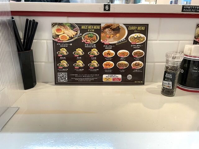 券売機は無く後会計制。主なメニューはポタージュカレー麺950円、しょうゆまぜ麺800円、塩ませ麺800円、みそまぜ麺800円、チキンカツ丼790円、チキンカレー950円、他。注文すると辛くないですがスパイシーにしますか、と聞かれます。ハウマッチで50円だそうです。またスパイシーは2〜5辛が選べるそうですが、3辛でも結構辛いとのこと。