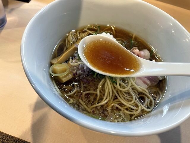 スープはさらさらの清湯醤油味。鯵煮干、平子煮干、白口煮干等を炊いた動物系不使用の煮干しスープ。メッチャ鯵でのっけから鯵をガツンと感じます。資本系ながらそれを感じさせないレベルとクオリティの高い味わいですごく美味しい!
