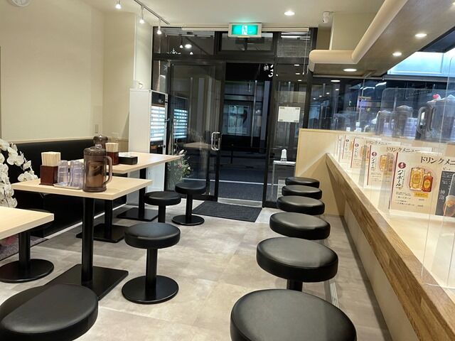 店内は厨房前に真っ直ぐなカウンター8席、4人卓x2、2人卓x1。カウンターは1席毎にアクリル板の仕切あり。