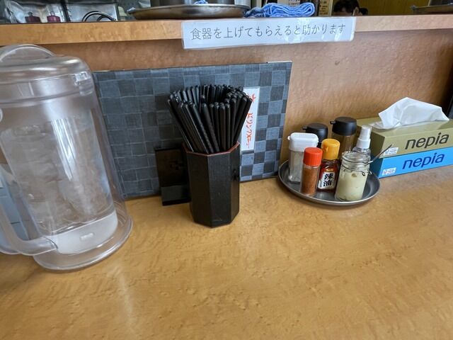 BGMはJ-POPとポップスで和洋いろいろ。箸は割り箸。卓上調味料は白胡椒、一味唐辛子、S&B辣油、醤油、酢、おろしにんにく。