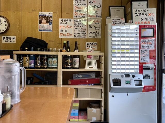 店内は厨房を囲むL字型カウンター7席(4・3)。消毒液は券売機横と調味料の隣に配置。12:00頃到着で先客2後客1。スタッフは2名。