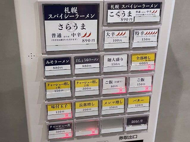 入店するとまず券売機で食券購入です。主なメニューは札幌スパイシーラーメン さらうま・こくうま 各890円、みそラーメン880円、白しょうゆラーメン880円、他。