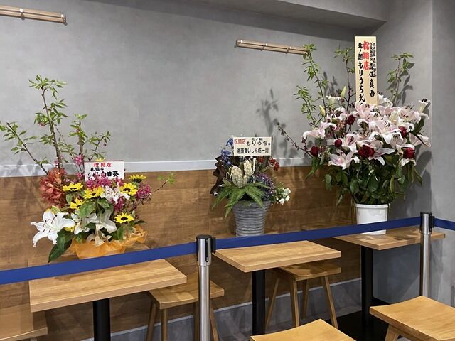 スタッフは男性2。開店祝花は森住製麺、札幌らーめん向日葵から。BGMはポップス。箸は割り箸。卓上調味料はなし。