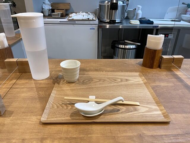 スパイシーラーメン を注文すると、辛さを普通か中辛どちらか聞かれます。店内は厨房を囲むL字型カウンター10席(9・1)。席はバッチリ指定されます。