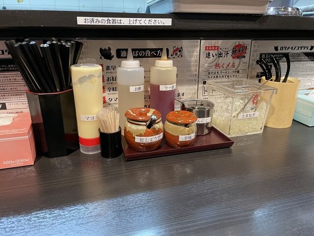 卓上調味料・薬味はマヨネーズ、酢、ラー油、ニンニク、紅しょうが、辛味、きざみ玉ねぎ。