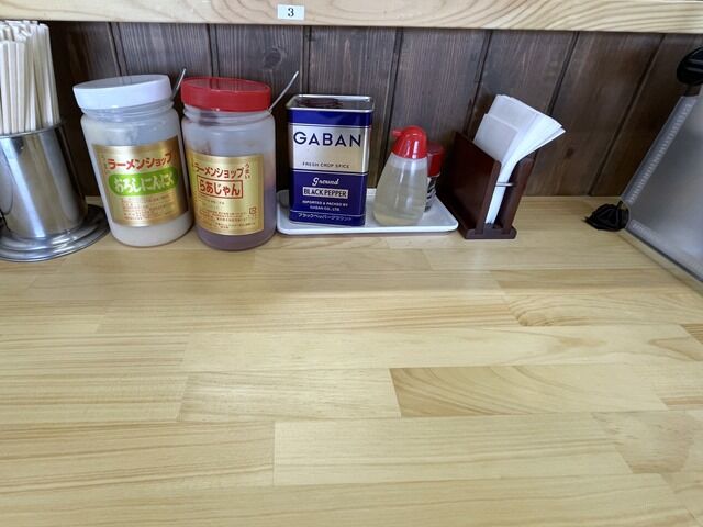 スタッフは厨房・ホールに男女合わせて4銘。BGMはFM Nack5。箸は割り箸。卓上調味料・薬味はおおろしにんにく、らあじゃん、GABANブラックペッパー、酢。