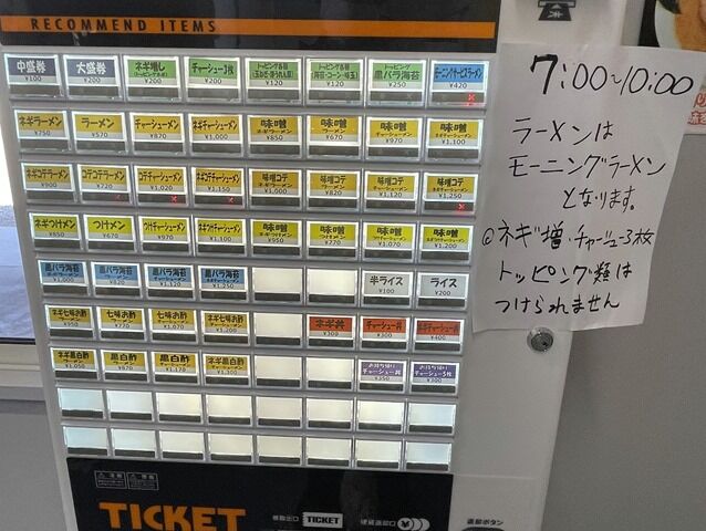 入店するとまず券売機で食券購入です。主なメニューはラーメン570円、ネギラーメン750円、味噌ラーメン670円、味噌ネギラーメン850円、コテコテラーメン720円、味噌コテラーメン820円、つけメン670円、味噌つけメン770円、モーニングラーメン(7:00~10:00)420円、他。